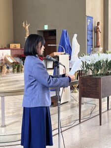 StageⅡ(5年生~中2)では一人ずつユリの花を持って聖堂までの道を歩き、祭壇のマリア様にお捧げをしました。