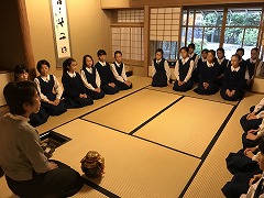 紅葉の美しい本校の茶室で、お茶のいたただき方とお点て出しを教えていただきました。