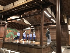 百余年の歴史ある能舞台で、子どもたちは能についてのワークショップを受け、続いて「敦盛」の一部を鑑賞させていただきました。
