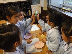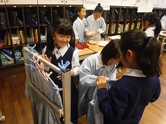 小学校 2017.12.12 1年生 『お手伝い名人』 生活科の学習で、1年生は『お手伝い名人広場』を開きました。家の仕事にはどのようなものがあるか調べ、その中からいくつか選んで、やり方のこつを家の人に聞いて練習しました。またグループごとに、その技を他のグループの人達に教えました。家の仕事の大変さに気づき、自分も家族の一員として、できる仕事をしていこうという気持ちを持つことができました。 前の記事へ 次の記事へ