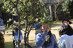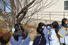 2月8日(木)冬晴れ 1年生と2年生が校庭の樹木の冬芽を見てまわりました。