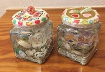 ジェルキャンドル作りでは、竹野の砂と貝殻を用いて、思い思いの世界に一つのマイキャンドルを作りあげました。