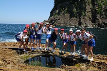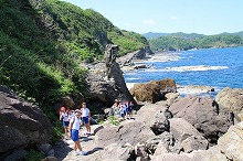 猫崎ウォーキングでは、力強く波しぶきをあげる日本海を見ながら、自然が創った岩と岩を渡り歩きました。岩場を這うフナムシに歓声を上げながら、自然の雄大さを感じました。