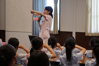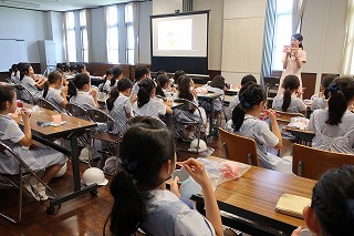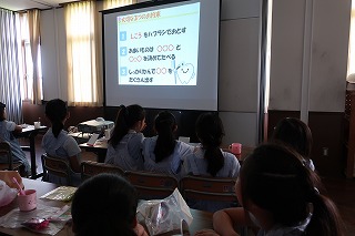 歯科医の先生から、「どうして虫歯になるのだろうか」「虫歯にならないようにするにはどうしたらよいのか」「噛むことの大切さについて」のお話を聞きました。子どもたちは、先生からの質問に興味津々。クイズ形式の質問を通して、歯の大切さを確認しました。