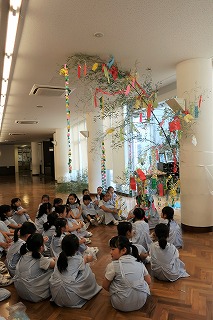 小学校 2018.07.10 七夕まつり 1、2年生合同で、七夕まつりをしました。 今回は1年生がお姉さんを招待する番。2学年のペアで活動します。 願いごとを書いた短冊や飾りに、2年生のお姉さんが作ってくれたこよりをつけて、笹の枝に結びました。 できあがった笹飾りを見ながら、みんなで『たなばたさま』の歌を歌いました。 1年生と2年生。少しずつ絆が深まっていきます。 前の記事へ 次の記事へ