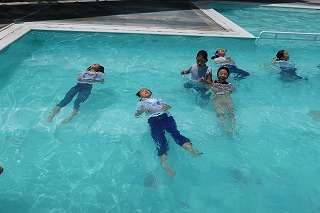 今日は、着衣のまま「背浮き」「エレメンタリーバックストローク」「ペットボトルを使っての背浮き」の練習をしました。