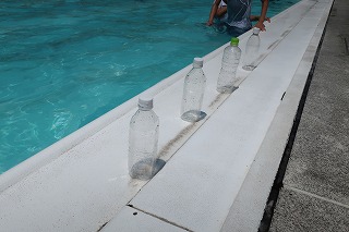 そこで、体力を温存するための方法、ペットボトルの浮力を利用して浮くことなどを、実際にプールで体験しました。