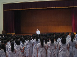 シスター棚瀬校長先生から、「いつも唱えるお祈りの『今日一日中、自分のつとめを一生懸命に果たし・・・』という言葉に心をとめてください。今あなたたちが見たり聞いたり学んだりしていることが、大人になるあなた自身をつくっていくのですよ。」というお話がありました。