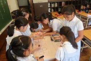 今日は各班で6年生が中心となって、チームの合言葉、一人ひとりの顔やイラストを描き込んだ応援の旗を作りました。