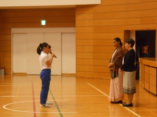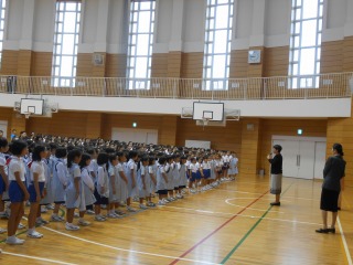 児童会役員が代表で挨拶し、全員が歌でお迎えしました。