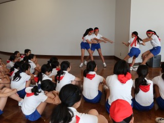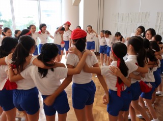 小学校 2018.10.12 小学校 StageⅡ朝礼 来週末の運動会に向けて、StageⅡ朝礼では、5、6年生の合同競技「棒引き」の作戦会議が行われました。 赤組、白組、青組に分かれて勝つためのコツを、6年生の応援リーダーが教えます。 息を合わせて引くこと、腰をしっかりと落として粘ること、とにかく速く棒を取りに行くこと…。 棒引きが初めての5年生は、一生懸命に話を聞いていました。 本番まであと一週間、練習にも気合が入っています。 前の記事へ 次の記事へ