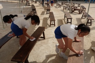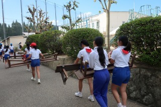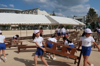 高学年は、各係を受け持って、仕事を進めていきます。今日は午後から、明日の本番に向けて椅子の準備をしたり、運動場を整えたり、練習や準備をしたりしました。