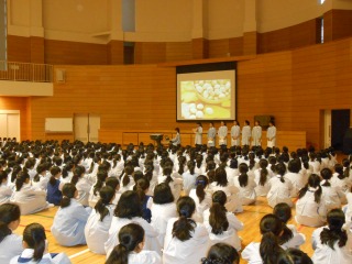 ハイチと本校の関わり、ハイチのようすなど、写真を交えて説明し、募金のお願いをしました。集めたお金は海を越え、中米ハイチの聖心会に送られます。そこで、病院や子ども達の施設、教育のために使われます。