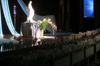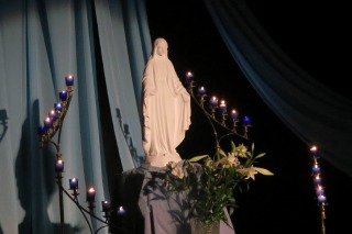 ブルーの布とろうそくの火に囲まれたマリアさまはとても美しく、うっとりと見あげるほどです。