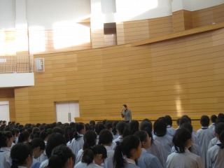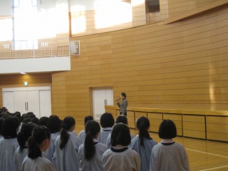 「新しい年になりました。今年は年号も新しくなり、変化の多い年となります。そんな新しい年にぜひ、皆さんに頑張ってほしいこと、それは3つの平和です。1つ目の平和は、自分との平和。自分をよく見つめ、大切にしてください。2つ目は、周りとの平和です。友だちや家族を大切にするには、人を信じる心が大切です。信じる気持ちから、相手への感謝の心や謙虚な心が持てます。3つ目は、環境や自然への平和です。学校の自然、自分の周りの環境が整っていることへの感謝の気持ちを忘れないでください。3つの平和を保てるように、この1年考えて行動してください。素敵な1年になると思います。」