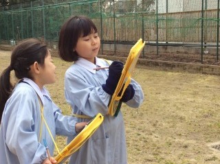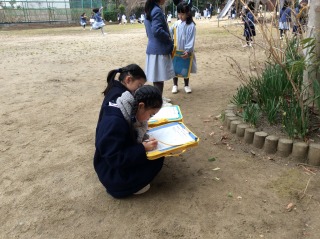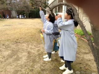 今日は、1年生と2年生が合同で冬芽を見つけに出かけました。まず、はじめに冬芽とはどんなものか話を聞き、写真を見ました。小さな冬芽の中に、丁寧に折りたたまれた葉っぱやつぼみが春を待っていること、それには生き物たちの知恵があることなどを知りました。