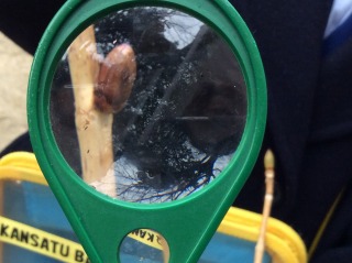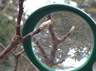 いよいよ外に出てよく見てみると、いろいろな形、大きさ、色のものがあること、何枚も皮を着ているような冬芽もあれば、毛皮のコートを着ているような冬芽、つやつやの冬芽もあれば、葉がむき出しになっている冬芽など、次々に冬芽を見つけては歓声が上がります。その中で、お気に入りのものを見つけ、冬芽の様子を「冬芽レポート」として書きとめ、虫眼鏡を使って写真を撮りました。
