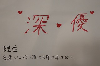 初日の今日は、3つの活動に取り組みました。一つ目は「親友とは?」です。自分たちが考える親友の意味を考え、漢字や絵を使って表現します。 例えば、「真優」や「芯友」、「新you」などです。各班の「しんゆう」の理由を聞き合うことで、親友の意味を確かめていきました。