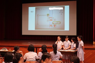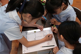 錬成会2日目は、「トトロの森をさがせ」というゲームを行いました。一つの地図を完成させるために、班のメンバー5名がそれぞれ異なる情報をもち、それを伝え合う中で地図の全体像を描いていくというものです。情報と情報、イメージとイメージを重ね合わせることで、ゴールへと近づくことができます。初めは簡単と思っていた子供たちですが、多くの情報が矛盾なく整合する地図を作るのは意外と難しく、途中で投げ出したくなることもあったようです。しかし、「もう一回考えてみよう」など前向きな声をかけ合いながら、完成へと向かっていきました。