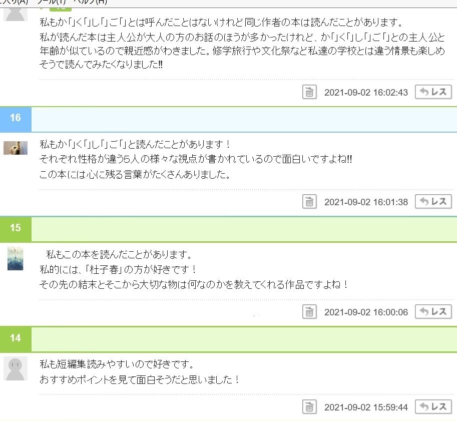 夏休み明けからオンライン授業となっていますが、もともと計画していた8年生の読書会も、オンラインで実施することになりました。PowerPointで夏休み中に読んだ本を紹介するスライドを各自あらかじめ作り、それを持ち寄ってグループ内で紹介しあい、オンライン掲示板を使って意見交換をしました。