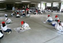 朝の集いで元気よくラジオ体操をし、朝ごはんの後は焼杉細工に取り組みました。