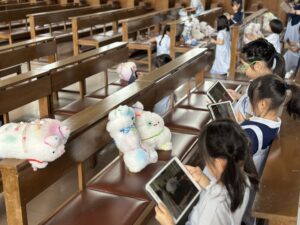 小学校 2025.10.02 1年生 図工科 1年生は図工科で「ふわふわだっこちゃん」を作成しました。綿を上手に使って可愛らしい人形を作りました。自分の作った作品が記念となるように、聖堂や祈りの広場、運動場、南庭などに一緒に行って、iPadを使って撮影しました。人形と一緒に撮影したい人は友だちに撮影してもらって工夫することができていました。思い出に残る作品が写真におさまりました。 前の記事へ 次の記事へ