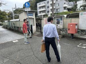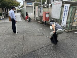 8月に宝塚市子ども議会がありました。子ども議会は宝塚市子ども条例に基づく、市の施策のひとつです。今回、本校の6年生児童が参加しました。宝塚市議会において、市長や議員が見守る中、通学路である小林駅周辺の安全対策や環境整備について意見表明をしました。その意見を受けて、この度、教育委員会と市役所の方が視察に来られました。タイル敷きの道路の整備や、通路確保のためのポール設置を検討していただくことができました。年度内には道路整備とポール設置をする方向で話が進んでいます。