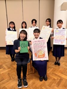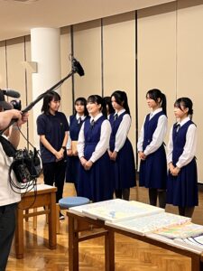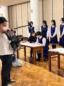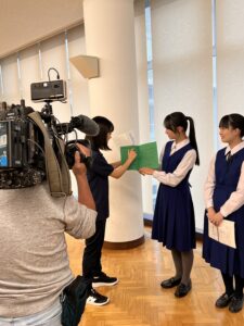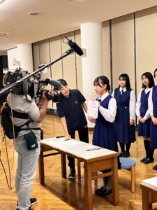 中高花文字クラブがテレビ生出演しました。サンテレビの情報番組「NEWS×情報 キャッチ+ 部活中継」は、タレントのくわがた心さんのレポートで、スタジオと学校の花文字クラブをつないで放送されました。
