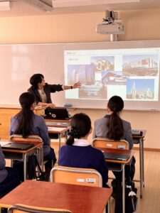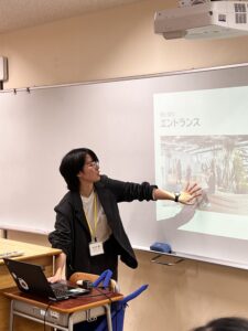 第7回の土曜講座は、「オフィスって、ただの職場じゃない!? “空間づくり”の考え方をプロの仕事から学ぼう!」をテーマに、卒業生(87回生緑)の立花桜乃さんを講師に迎えました。立花さんは大学と大学院で建築を学び、現在は空間デザインを専門とする企業で働いています。