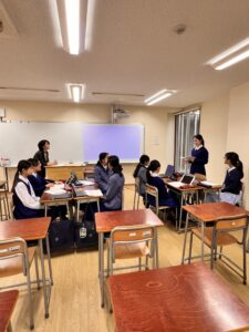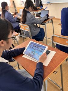 オフィスの共通スペースをどのようなコンセプトでデザインしたのかを知るために、普段使っているiPadやタブレットPCを使ってWeb空間に入り込んで、工夫された内部の様子を観察しました。壁紙や置かれている机椅子などに、ひとつずつ意味や目的があり、働く人が力を発揮できるような工夫がされていることがわかりました。おしゃれなカフェやフードスペースもあり、夢が膨らみました。グループワークでは自分の気に入った場所を見つけて、それについて意見交換をしました。参加した小6から高3の児童・生徒8名は、上級生のリーダーシップのもと、活発に話し合い、グループとしての意見を発表しました。