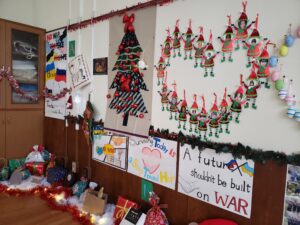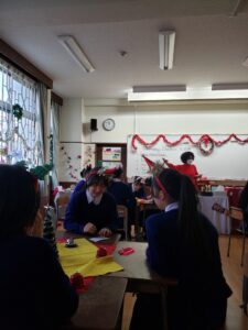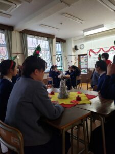 高等学校 2025.12.17 高3英語 クリスマスパーティー 12月17日(水)高3英語 論理・表現Ⅲの授業で、クリスマスパーティーをしました。 高校視聴覚室は、例年ネイティブの先生が張り切ってクリスマスの飾りつけをしてくださいます。 生徒たちはトナカイやツリーのカチューシャを付けて、クリスマスにちなんだゲームをしたりして楽しんでいました。 前の記事へ 次の記事へ