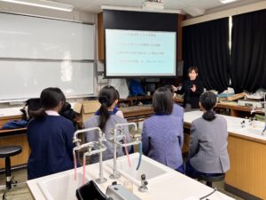参加生徒は中1、高1、高3の計6名。同大学で教授を務める卒業生の喜田紗斗美さん(61回生赤の学年)が中心となって、薬学部の先生方2名と共に本校生徒のために講座を開催してくださいました。