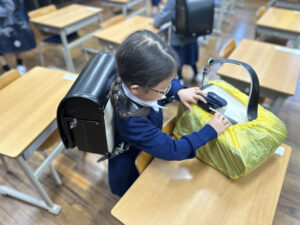 ランドセルカバーをつけてあげる姿がありました。